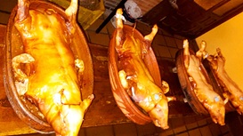 Cochinillo asado presentado entero sobre fuente oval, piel dorada y crujiente y carne tierna y jugosa.